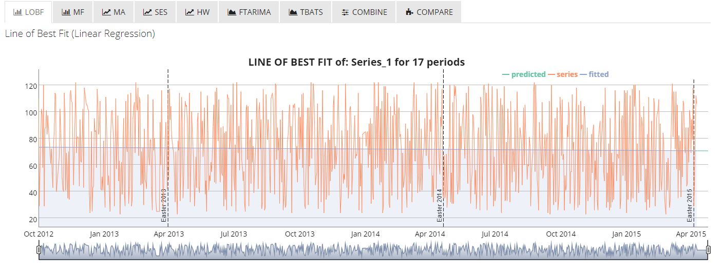 *Line of best fit (regression) *Moving average *Exponential smoothing (simple & Holt-Winters) *ARIMA with Fourier Transform *TBATS *Hybrid forecast ensemble model